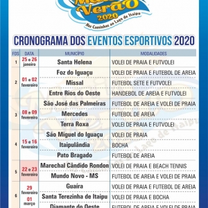 A abertura das atividades ocorrerá dias 25 e 26 de janeiro em Santa Helena, no Balneário Terra das Águas, com as modalidades de vôlei de praia e futevôlei. No final de semana dos dias 01 e 02 de fevereiro o Mais Verão ocorrerá em três municípios, Foz do Iguaçu, com vôlei de praia e futebol de areia, Missal, com futebol 7 e futevôlei e Entre Rios do Oeste com handebol de areia e futevôlei.
