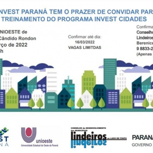 A Invest Paraná, com a Universidade Estadual do Oeste do Paraná (Unioeste), Conselho de Desenvolvimento dos Municípios Lindeiros ao Lago de Itaipu e Governo do Estado do Paraná, desenvolve o treinamento do Programa Invest Cidades na região. O evento está programado para 22 de março, das 09h às 16h no Campus da Unioeste de Marechal Cândido Rondon.