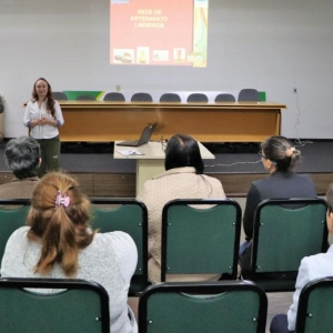 A palestra é proferida pela diretora técnica do Conselho dos Lindeiros, Sandra Finkler e consiste em explicar o que é a Rede de Artesanato, porque foi formada e quem pode participar.