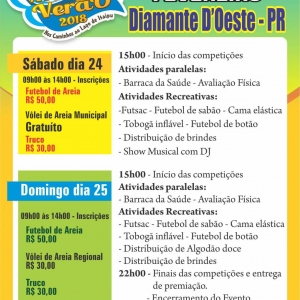 Em Diamante D’Oeste, segundo o chefe da Divisão de Esportes, Junior Lippert, as competições iniciam sábado, às 15h, com futebol de areia, vôlei de praia municipal e truco. As inscrições podem ser feitas a partir de 9h e custam R$50 para o futebol de areia e R$30 para o truco.