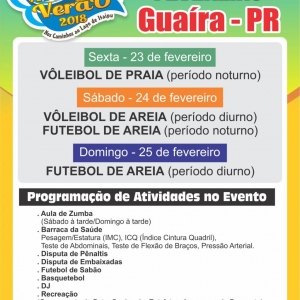 Em Guaíra a abertura será na sexta feira (23), às 18h, com jogos de vôlei de areia masculino e feminino no Centro Náutico Marinas. No sábado, a programação começa às 08h, e segue até às 22h, com jogos de vôlei masculino e feminino, basquete 3 x3 masculino, aulas de zumba  e futebol de areia. A programação continua domingo, das 08h às 21h com jogos de futebol de areia.