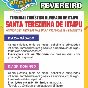 Em Santa Terezinha de Itaipu o Mais Verão será realizado no Terminal Turístico Alvorada de Itaipu, com diversas atividades esportivas e recreativas. Segundo o secretário de Esportes e Lazer, Remulo Ramalho, as inscrições poderão ser feitas nos dias do evento até às 09h e 30min, no terminal turístico.