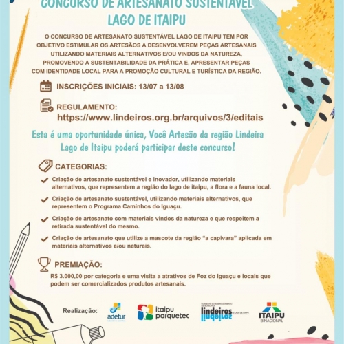O Conselho de Desenvolvimento dos Municípios Lindeiros ao Lago de Itaipu, em parceria com o Itaipu Parquetec e a Agência de Desenvolvimento Cultural e Turístico da Região Cataratas do Iguaçu Caminhos ao Lago de Itaipu (Adetur), promove o "Concurso de Artesanato Sustentável ao Lago de Itaipu". O objetivo é promover, incentivar e desenvolver artesanatos que refletem a identidade cultural, de maneira sustentável, criativa e inovadora, no entorno do lago de Itaipu.