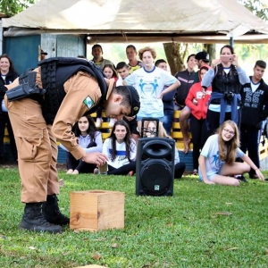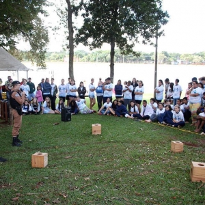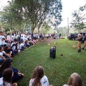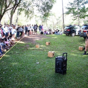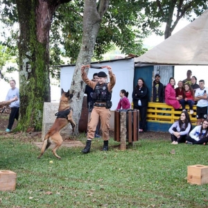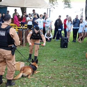 Além das dinâmicas, houve palestra com o BPFron, com explicações a respeito de como é realizado o trabalho de combate ao tráfico de drogas, ações que empregam, além das táticas tradicionais, os cães farejadores.