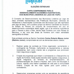 O documento foi assinado por Ratinho Junior e Darci Piana como forma de compromisso com a região dos municípios lindeiros ao Lago de Itaipu. “Aqui é uma região importante para o Estado. Tem uma produção agrícola muito forte. Precisamos incentivar a industrialização e geração de empregos. Na segurança teremos o projeto de instalação de câmeras e tecnologia para fazer o combate ao crime organizado”, destacou Ratinho Junior.