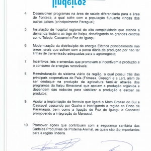Dentre as demandas da Carta Compromisso estão questões como segurança, profissionalização de jovens, programas de saúde diferenciados, instalação de hospital regional de alta complexidade, sistema energético, energias renováveis, sistema viário, implantação de ferrovia e segurança sanitária para das cadeias produtivas de proteína animal.