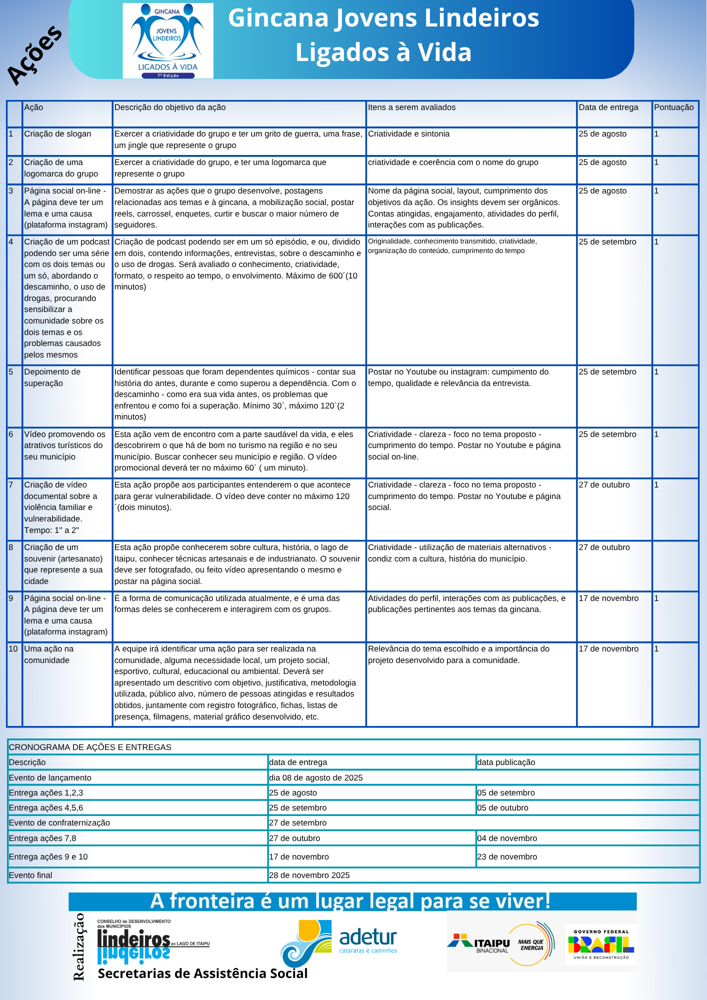 | GINCANA JOVENS LINDEIROS LIGADOS À VIDA | ENTREGA DAS AÇÕES | |||||||||||