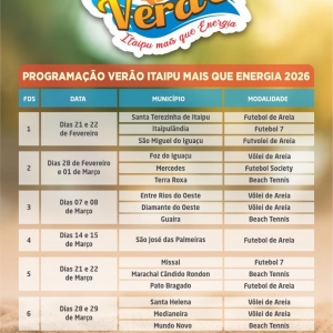 A programação do evento contempla diversos municípios e modalidades esportivas. Nos dias 21 e 22 de fevereiro, as atividades acontecem em Santa Terezinha de Itaipu, com futebol de areia; em Itaipulândia, com futebol 7; e em São Miguel do Iguaçu, com futevôlei de areia.