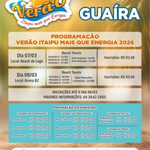 Em Guaíra as atividades também iniciam no sábado, a arena Beach do Lago, com o beach tennis, femininos C,D e E, além do misto municipal e regional. No domingo, na Arena B2, haverá continuidade do beach tennis com o masculino C, D e E, open masculino e feminino. Com inscrições no valor de R$ 83,90, abertas até o dia 06 de março, o torneio oferece premiação em dinheiro em todas as categorias.
