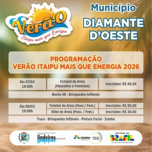 O Verão Itaipu Mais que Energia vai a mais três municípios no final de semana dos dias 07 e 08 de março. Guaíra, Entre Rios do Oeste e Diamante D’Oeste sediam a etapa. O projeto já passou por Santa Terezinha de Itaipu, Itaipulândia, Pato Bragado, Foz do Iguaçu, Mercedes e Terra Roxa.