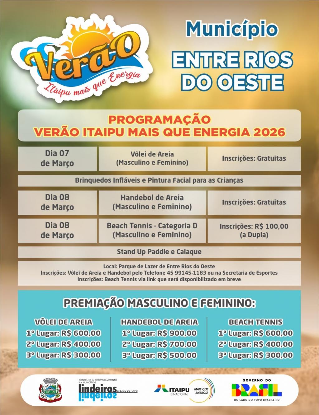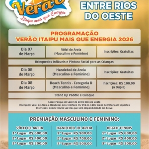Em Entre Rios do Oeste a programação de sábado contará com vôlei de areia, masculino e feminino (inscrições gratuitas), brinquedos infláveis e pintura facial. Para o domingo estão programados o handebol de areia, masculino e feminino (inscrições gratuitas) e o beach tennis categoria D, também masculino e feminino (inscrições R$100, por dupla). Para todas as categorias haverá premiação em dinheiro. A programação também inclui stand up paddle e caiaque.