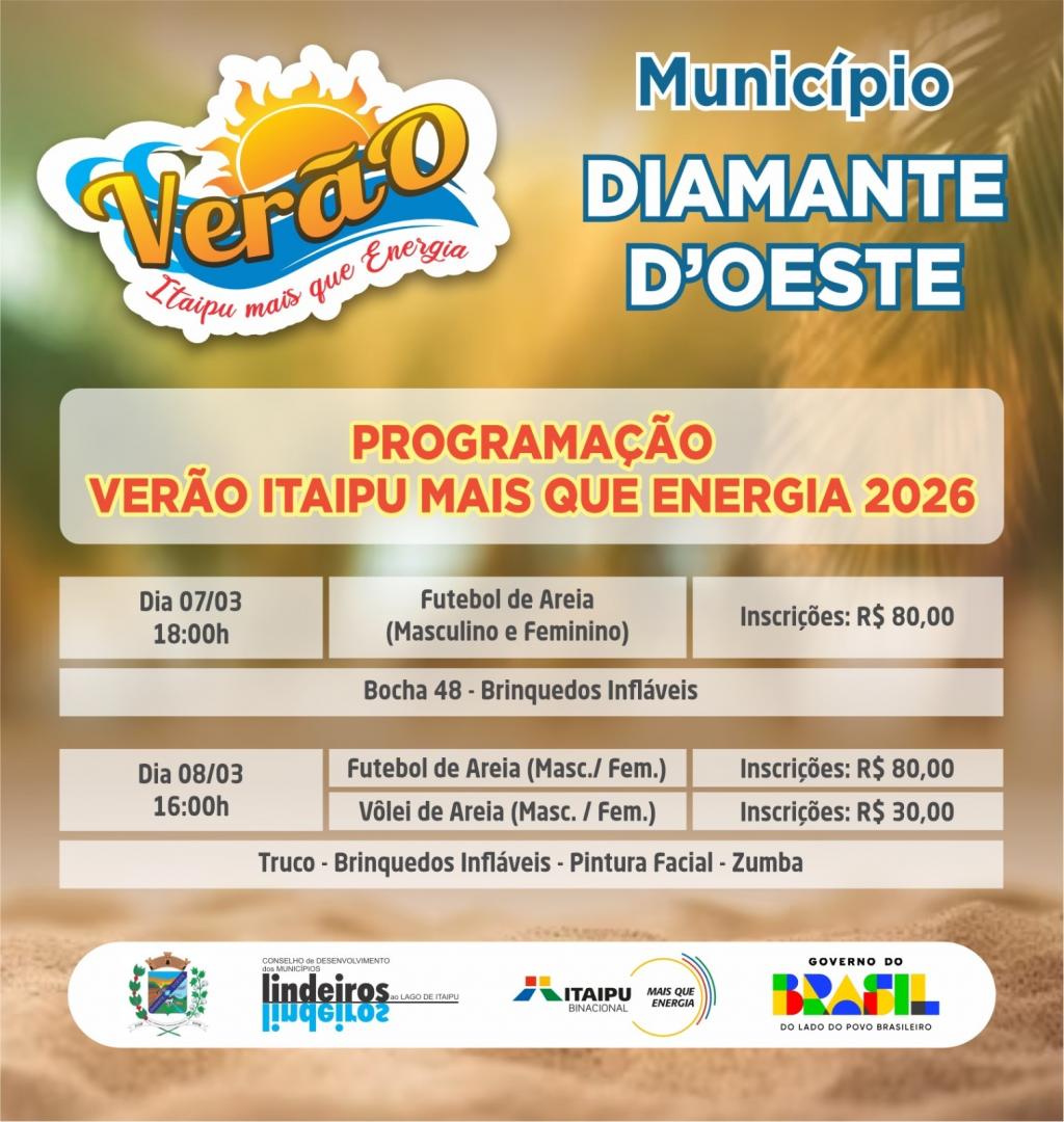 Diamante D’Oeste terá futebol de areia, masculino e feminino, no sábado (07), a partir de 18h (inscrições R$80), juntamente com bocha 48 e brinquedos infláveis. No domingo (08), a partir de 16h, serão realizados os jogos de futebol de areia, masculino e feminino (inscrições R$80) e vôlei de areia, masculino e feminino (inscrições R$30), além de truco, zumba, pintura facial e brinquedos infláveis.