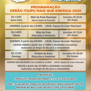 O Verão Itaipu Mais que Energia passará por mais um município no final de semana dos dias 14 e 15 de março. São José das Palmeiras sedia o evento. Os organizadores decidiram iniciar as atividades a partir de sexta-feira (13). Com isso, o Verão Itaipu Mais que Energia chega a 10 municípios.